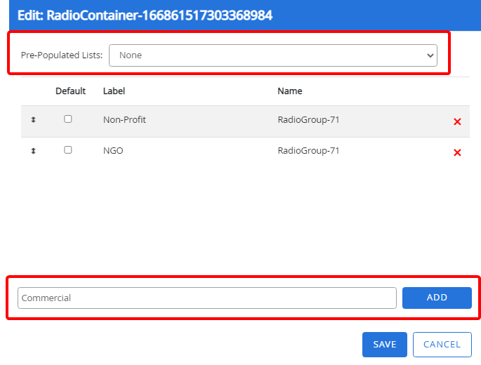 Type a name for the radio button option, and then click Add or select an option from the Pre-Populated Lists drop-down menu to add an item from the pre-populated list. The following options are available: