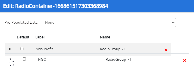 Rearrange the radio options to display them in a specific order. Click the double-headed arrow next to a choice and hold the mouse button. Move the selection up or down in the list and release the mouse button at the location you want to place the choice.