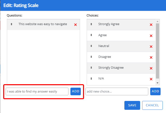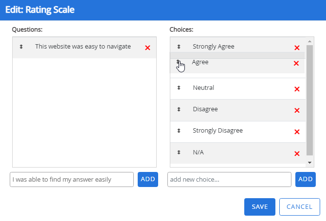 Rearrange questions and choices to display them in a specific order. Click the double-headed arrow next to a question or choice and move it to the desired location using a drag-and-drop operation.