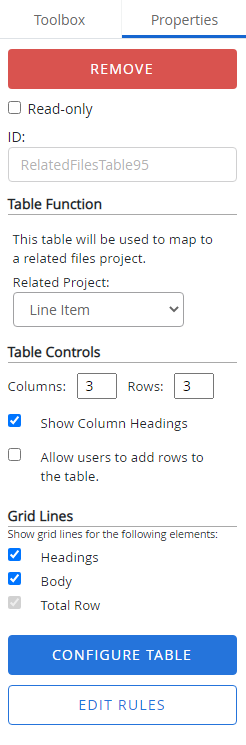 Configure Table: Opens the Table Configuration window where you can configure the related files table control.