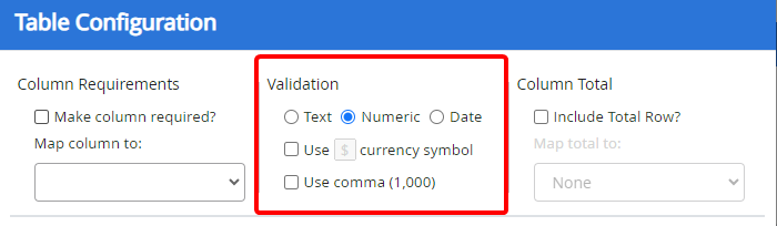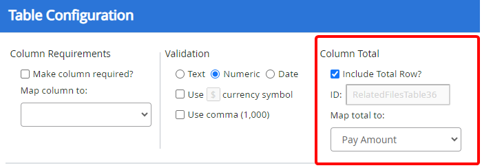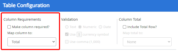 Include Total Row?: Adds a total row to the bottom of the column that will display the sum of all of the column values.