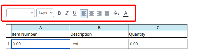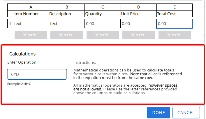 The calculations section allows you to calculate the value of the column based on the defined calculation. For example, in the screenshot below, we are multiplying the Quantity (C) by the Unit Price (D) to get the value for the Total Cost column.