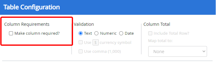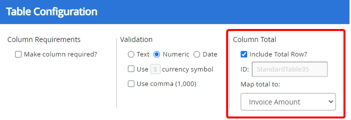 Include Total Row?: Adds a total row to the bottom of the column that will display the sum of all of the column values.