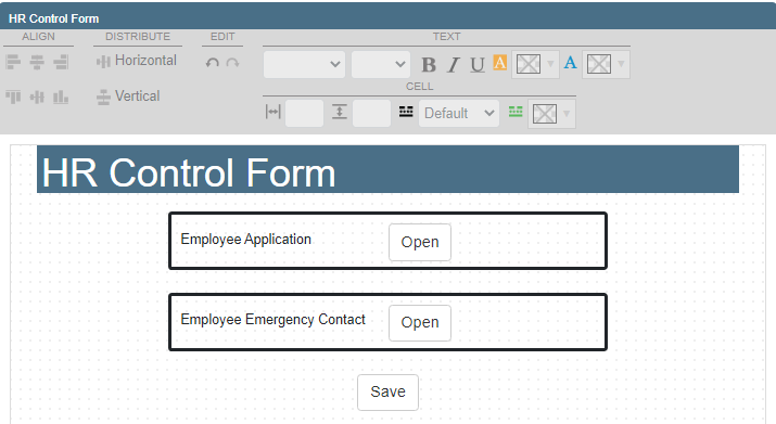 A Control Form provides you with an easy way to create a parent/child form relationship. The Control Form serves as the parent form, and form link controls are added for each child form selected during the configuration. All linked forms must be opened and completed or the user will not be able to submit the control form. See Form link control for more information.