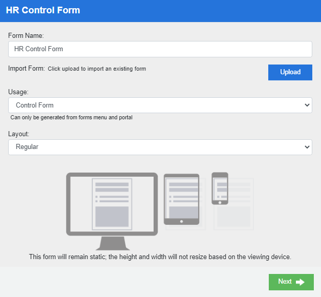 - Responsive: Allows a form to resize its height and width based on the screen size of the viewing devices.