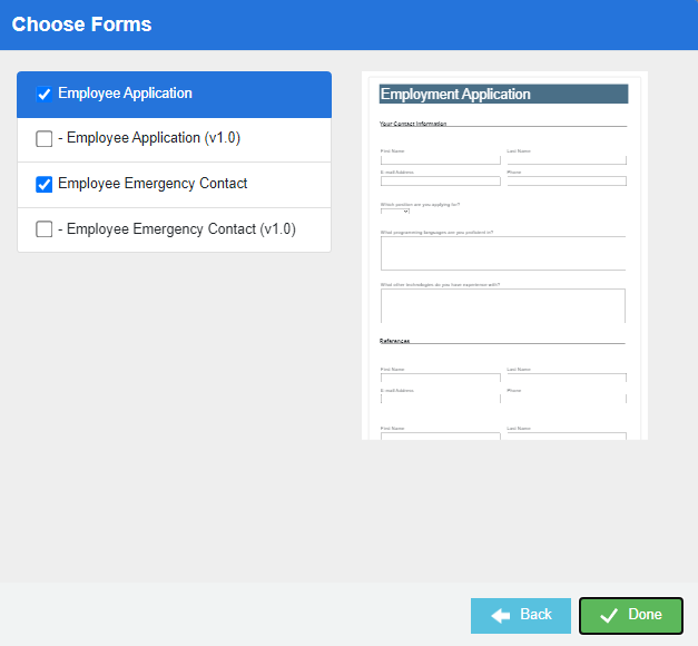 Select the check box next to the child forms you want to include on the parent form, then click Done.