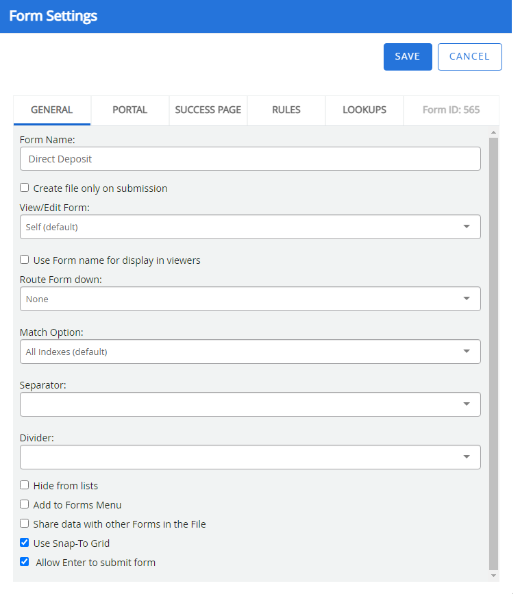 Add to Forms Menu: Makes the web form available in the Forms menu.