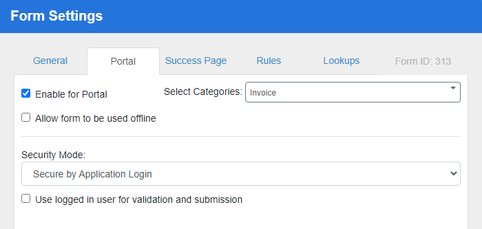 Security Mode: Restricts the access of users to the different forms within the Forms Portal. The following options are available: