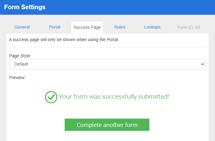 A Success Page is a separate page that can be displayed, after a successful submission of a form, when submitting the form from the Forms Portal or Forms menu.