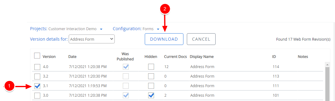 Version: Every time that a form is saved or published, a new version is created. You can think of each version as being its own form. New forms are generated in the latest version of the form. Like workflow versioning, forms that are generated in a particular version of a form are retained in that version.