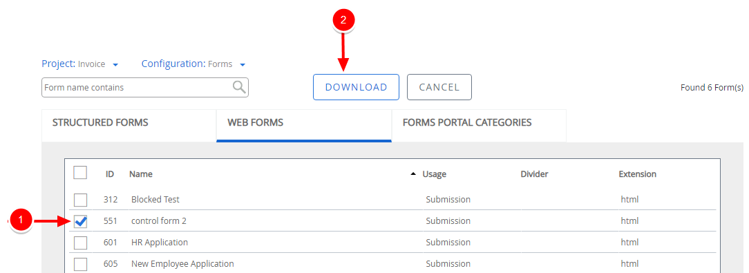 • Submission forms: A submission form type allow users to provide new information on the form that can be used to create a new file in FileBound. Submission forms can be created in HTML and PDF formats. These forms are available in the Forms Portal and Forms menu of a FileBound site.