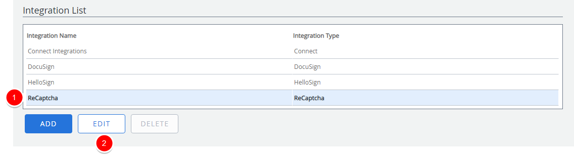 Select the ReCaptcha integration, then click Edit.