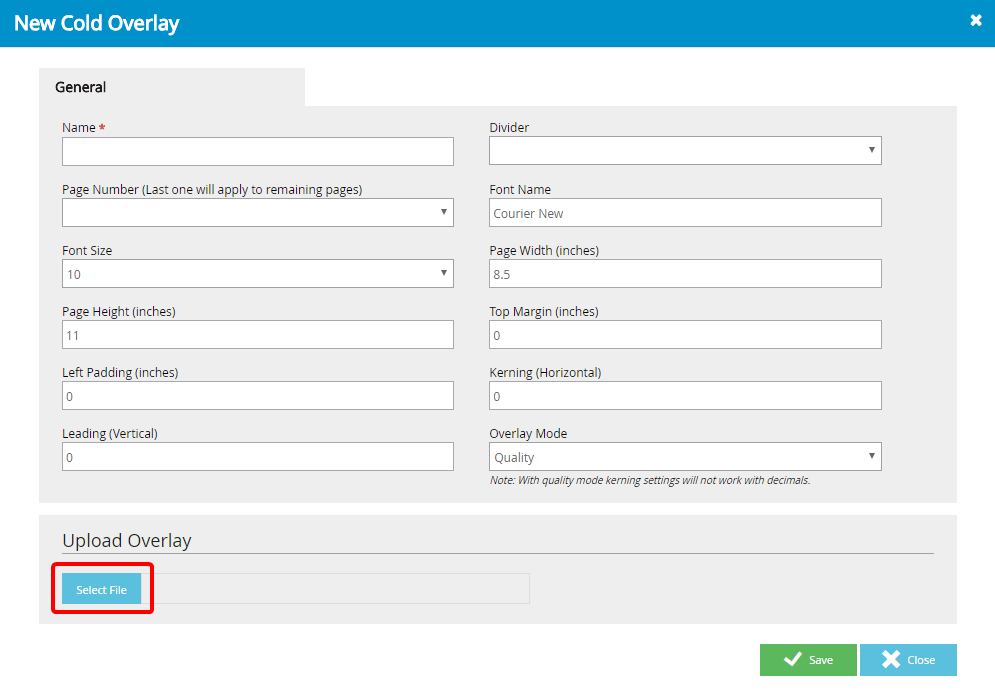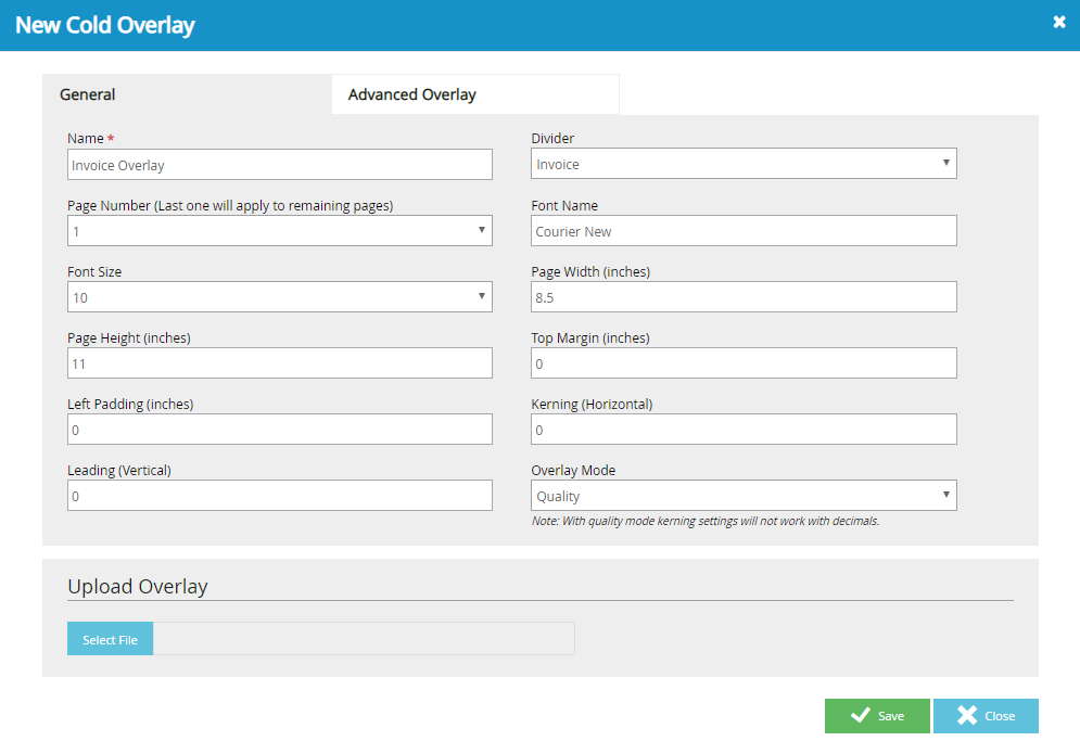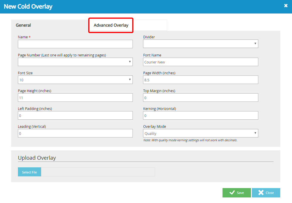 Page Number: Designates the page that the overlay should start to be applied. The overlay will apply to all of the following pages unless a new overlay is created for subsequent page numbers.