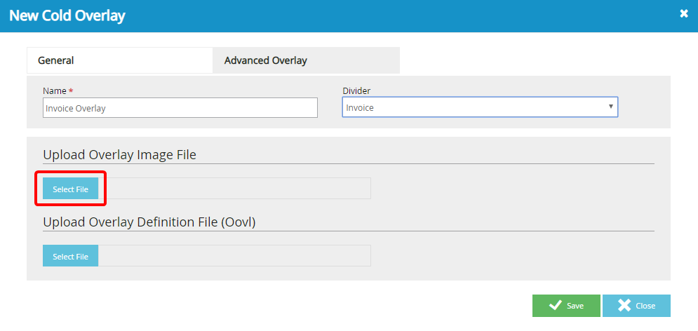 In the New Cold Overlay dialog box, configure the overlay on the General tab. You can add an advanced overlay created by in an external overlay designer using the Advanced Overlay tab. See Add an advanced overlay for more information.
