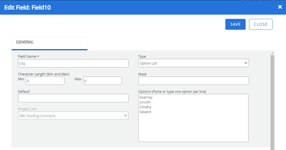 Project Link: For Project Link type index fields only, select a project from this list to display the Key Visual Field of all of the active files in the selected project in a drop-down list for the index field.