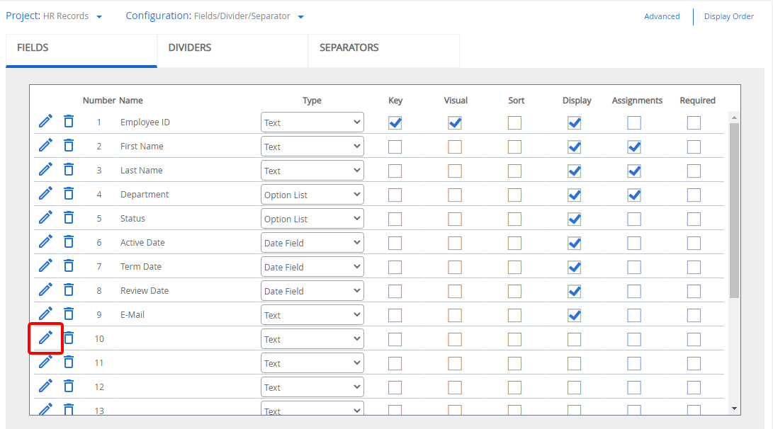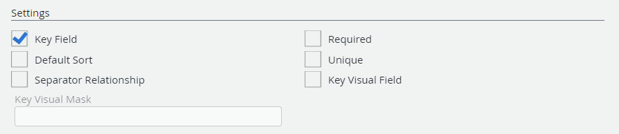 Key Field: Sets the index field as the key field for the project. The key field is required to match and merge files from other applications into the FileBound project. You can also select the Key check box on the Fields page to set the index field as the key field for the project.