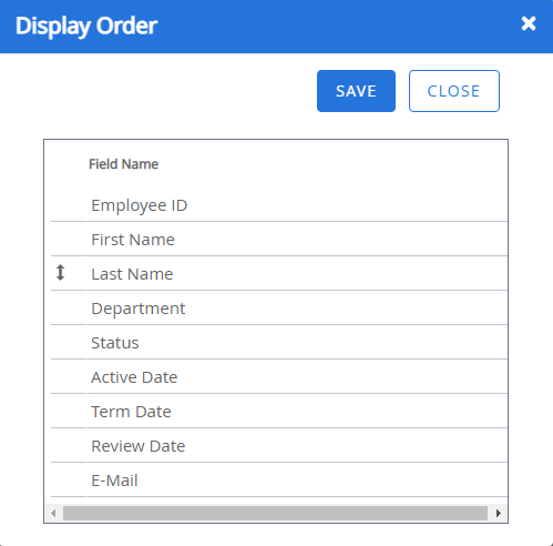 Search Results List: Displays the index field as a column on the Search results page. You can also select the Display check box on the Fields page to display the index field on the Search results page.