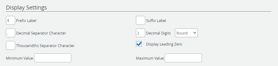 Decimal Digits: Specifies how many digits are allowed after the decimal, and whether they displayed by truncating or using common rounding principals. You can have up to four digits after a decimal.