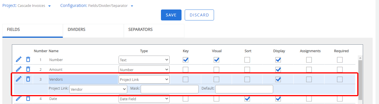Project link index fields contain a pre-populated list of the visual values from a linked project. You can type in Project link type fields to quickly locate a value you are looking for. When searching in a project link field, results are displayed from the key field and then the visual field in the following order: exact match, starts with, contains. Only the first 50 results will be displayed.