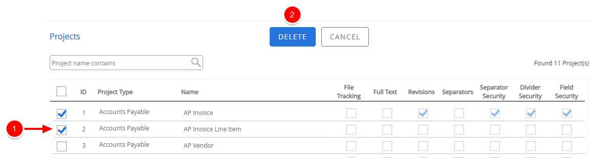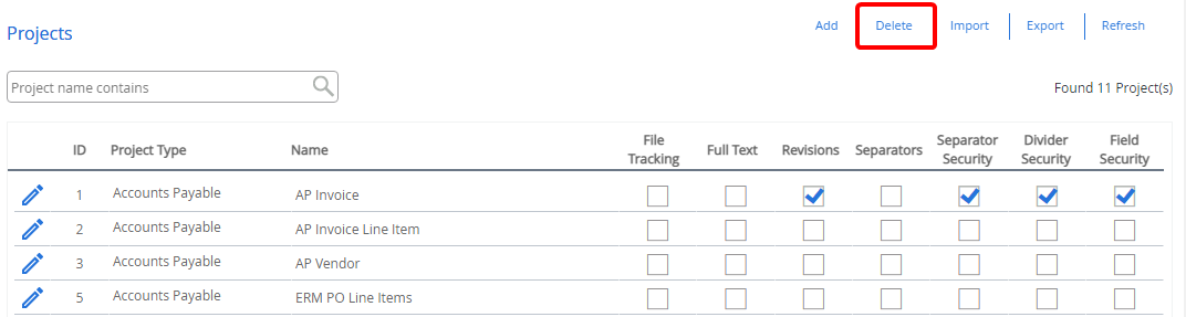Select the check box next to the project(s) you want to delete, then click Delete.