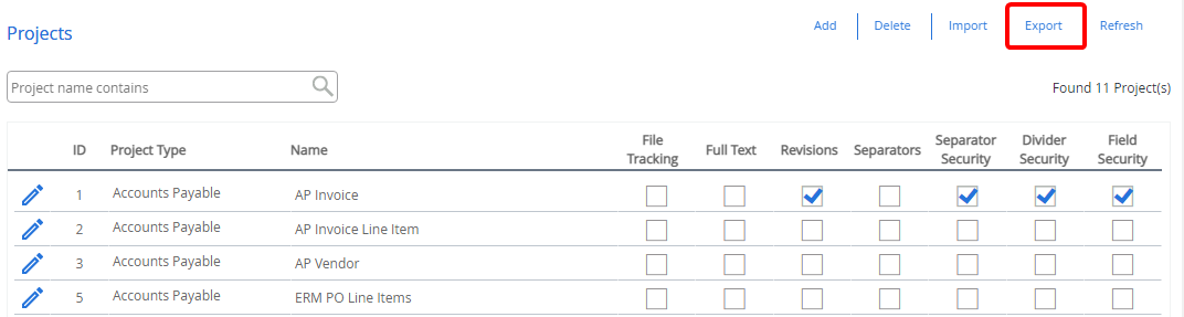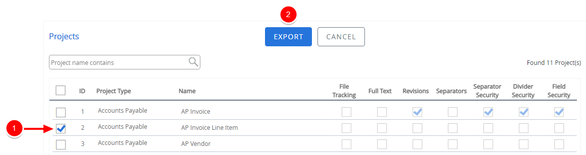 Select the check box next to the project you want to export, then click Export.