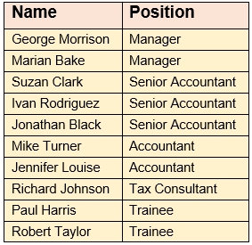 The table above lists the employees in the Accounts department and the position they hold.