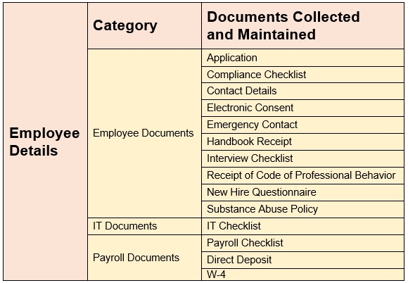 Each employee is required to furnish certain documents that are maintained by the HR department. These documents are categorized into employee documents, IT documents, and payroll documents.