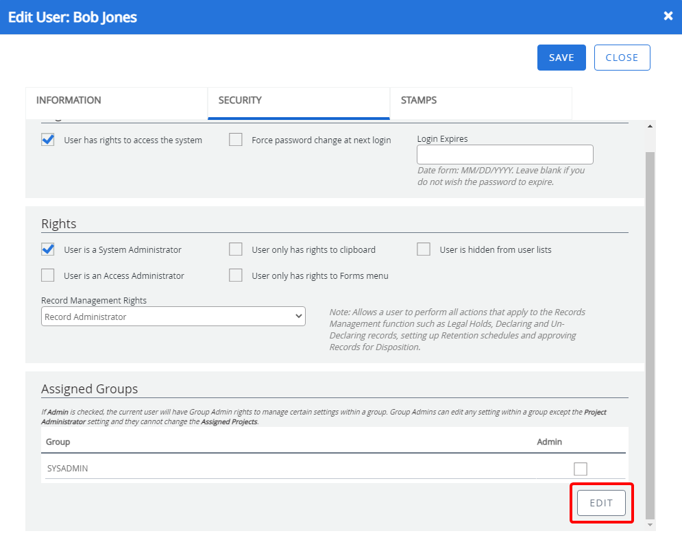 - Click Edit next to the user you want to assign as a Group Administrator.