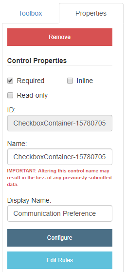 Configure: Opens the Edit Checkbox window where you can configure the checkbox control.
