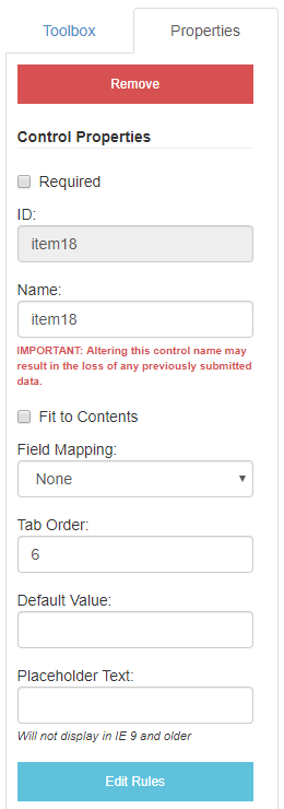 Edit Rules: Opens the Edit Rules window where you can configure conditional rules for the control. See Conditional rules for more information.
