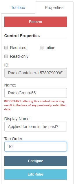 Configure: Opens the Edit Radio Button window where you can configure the radio button control.