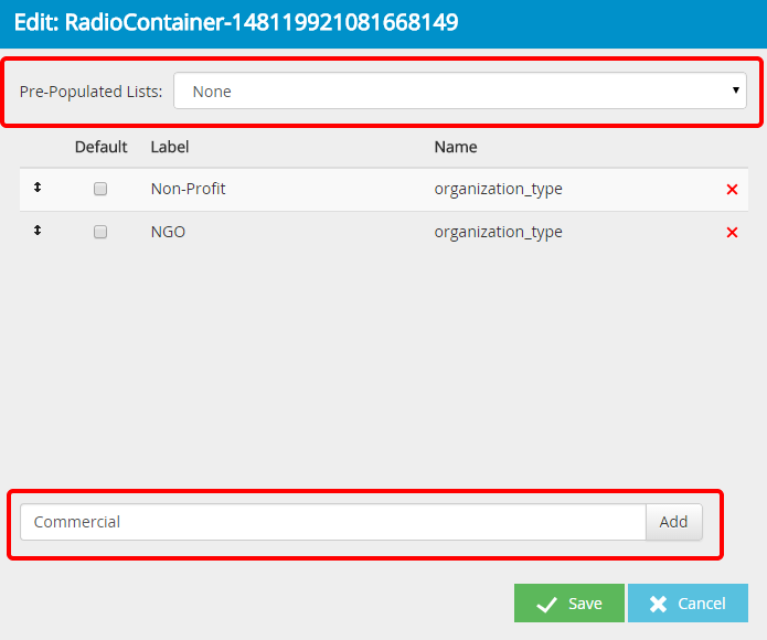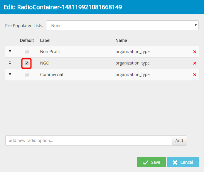 Type a name for the radio button option, and then click Add or select an option from the Pre-Populated Lists drop-down menu to add an item from the pre-populated list. The following options are available: