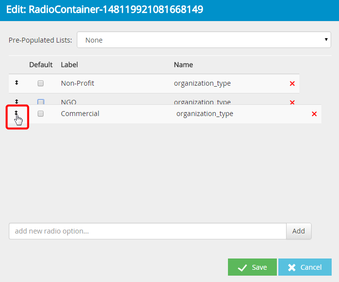 Rearrange the radio options to display them in a specific order. Click the double-headed arrow next to a choice and hold the mouse button. Move the selection up or down in the list and release the mouse button at the location you want to place the choice.