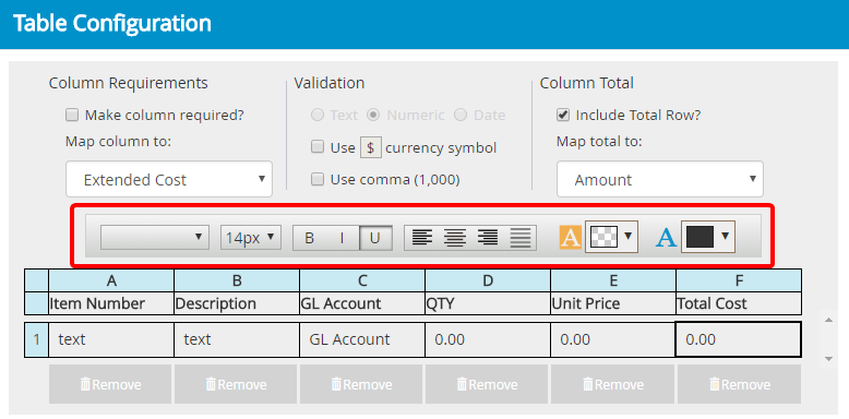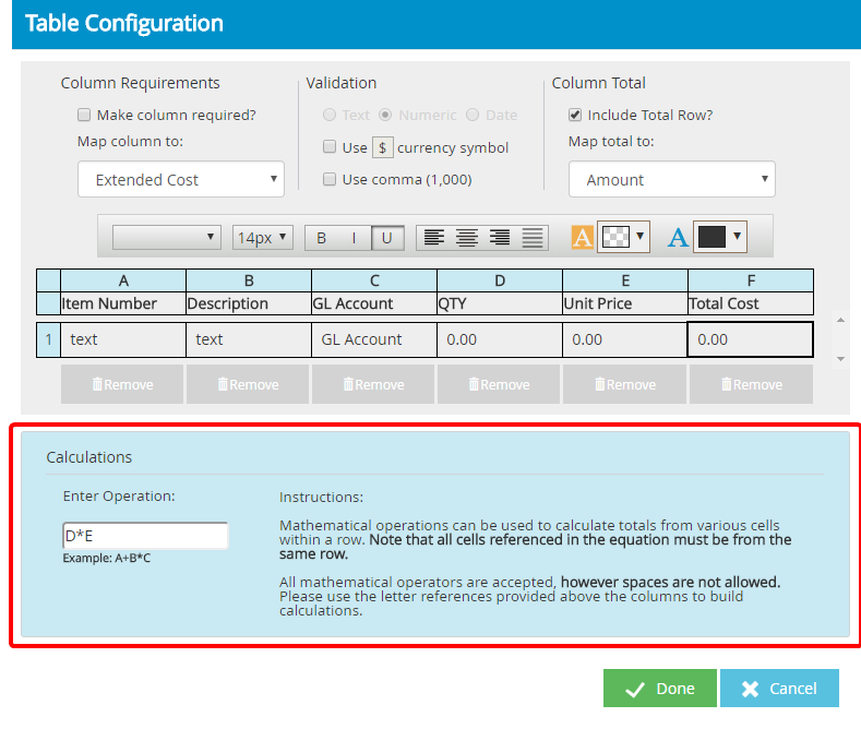 The calculations section allows you to calculate the value of the column based on the defined calculation. For example, in the screenshot below, we are multiplying the quantity (D) by the Unit Price (E) to get the value for the Total Cost column.