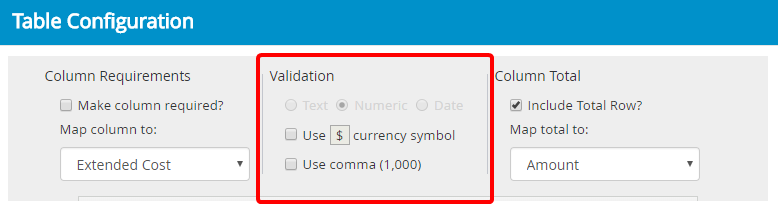 Use comma (1,000): If Numeric is selected as the validation option, select this option to automatically have a comma added to values entered in the column.