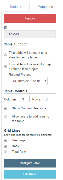 Configure Table: Opens the Table Configuration window where you can configure the table control.