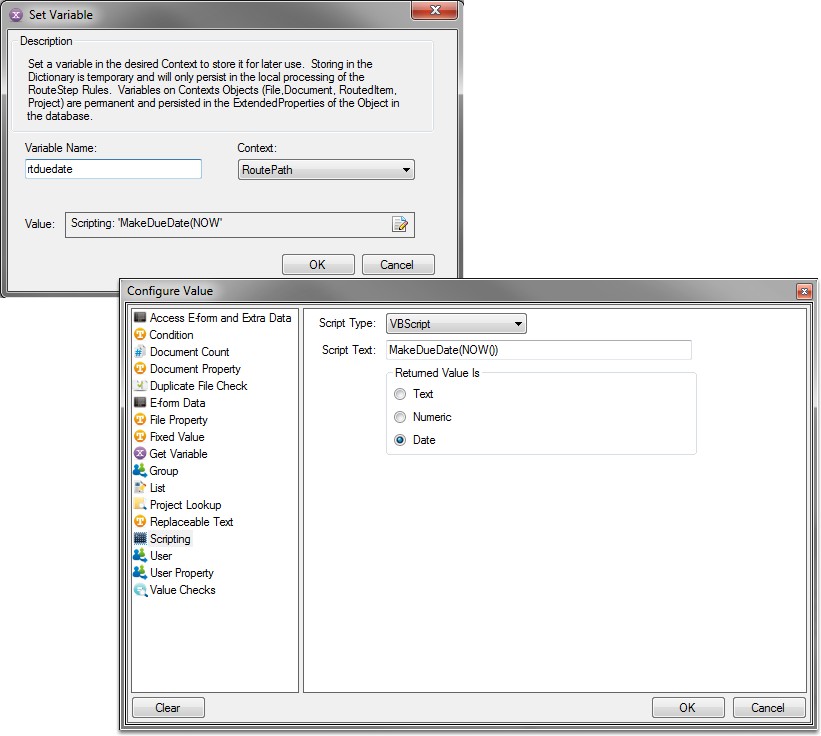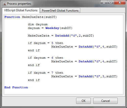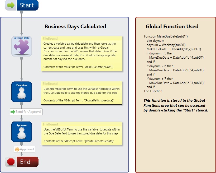 When a document is routed for approval, the first step is a custom action that will determine the date and time that the document started into the workflow. In this example a Global Function has been stored for the process. This global function was entered by double-clicking the "Start" stencil and will determine if Saturday and Sunday need to be figured into calculating the due date. In this example, the process must be completed in 2 business days. In the "Set Due Date" custom action, the "MakeDueDate" function is called and the current date and time is passed to the function to determine the due date. This due date is then stored within a variable labeled "rtduedate" in the context of the unique route path for that document. To use this due date, each following user step in the workflow will need to be an Assignable step type. The Assignable step type allows the Due Date for the step to be set using VB Script to call the "rtduedate" variable. Below is the script that is used in the VB Script term to call the function: