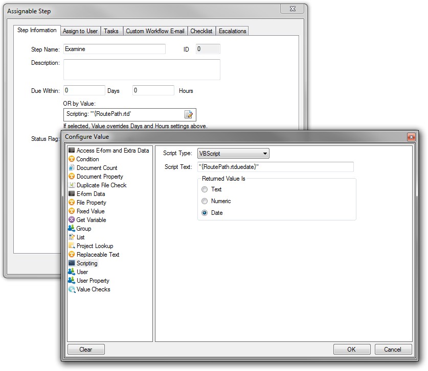 After the document moves through the Set Due Date custom action stencil it moves to the "Examine" step which is an Assignable step type. This stencil is configured as a standard single user type of step. On the Step Information tab in the Due Date area, the VB Script term is used to call the "rtduedate" variable which contains the due date for the process. Below is the script that is used in the VB Script term: