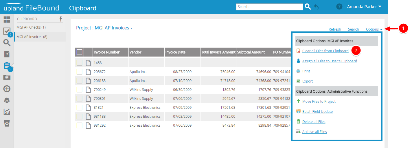You can quickly remove all files from your Clipboard. Removing a file from the clipboard only removes the reference to the file from the Clipboard. The file remains in the FileBound project and is not deleted.