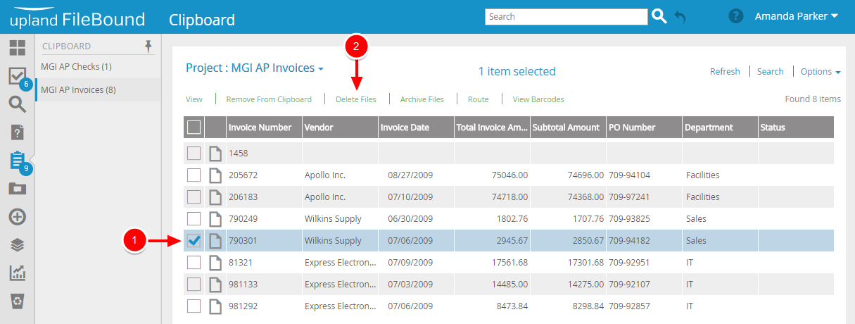 You can delete one or more files from a Clipboard. Deleted files are removed from your Clipboard AND deleted from FileBound.