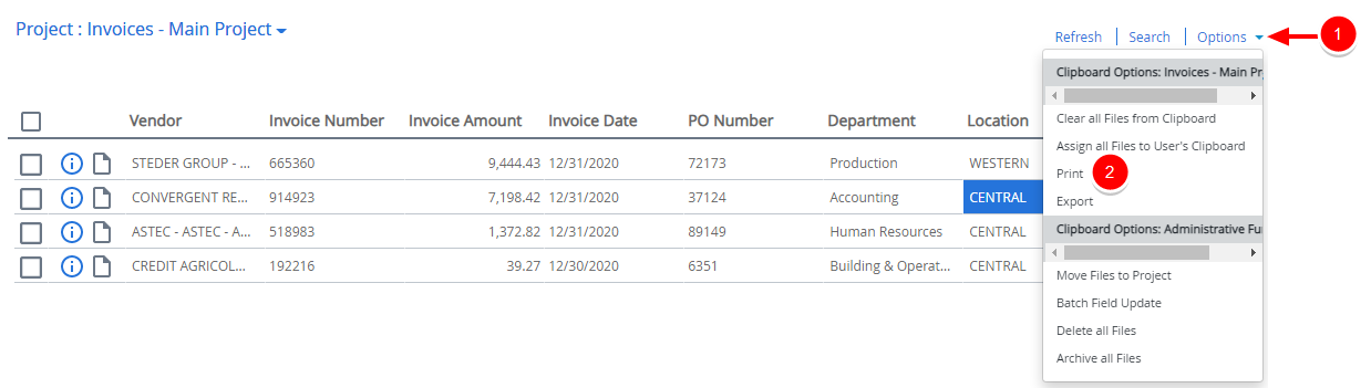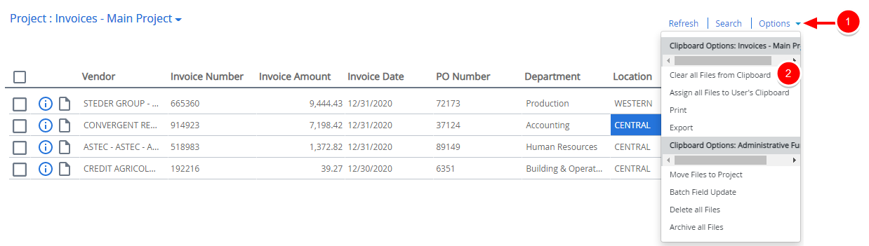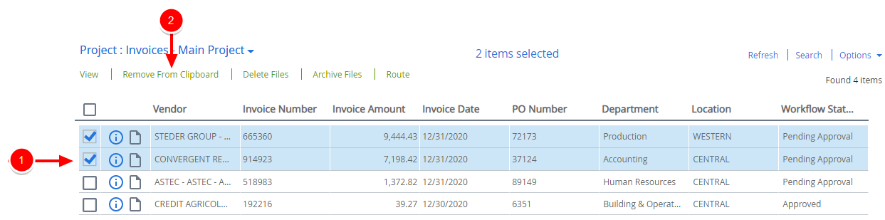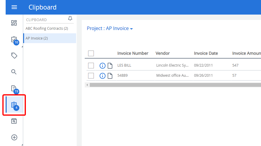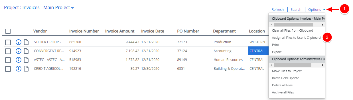 You can add files from your Clipboard to the Clipboard of another user. For example, if an auditor needs to perform an audit on all invoices that were approved in May 2017, you can assign all of the May 2017 invoices to the auditor's clipboard.