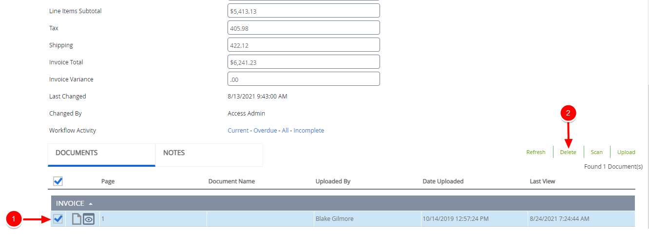 Select the check box next to the document(s) you want to delete, then click Delete.