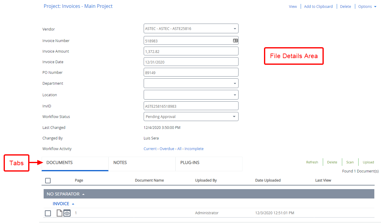 File Detail Area: The File Detail area displays index field values. Information also includes, the name of the user who modified the file last, and the date and time when it was last modified. You can see workflow related information on the file, if the file is used in workflow processes. Information is organized as: