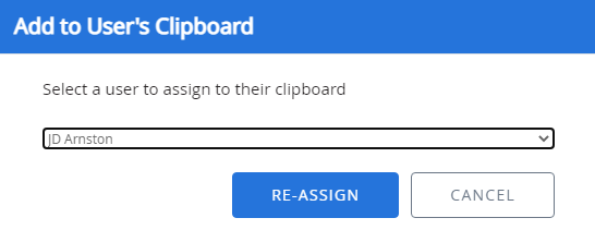 In the Add to User's Clipboard dialog box, select the user that you want to assign the files to, then click Re-assign.