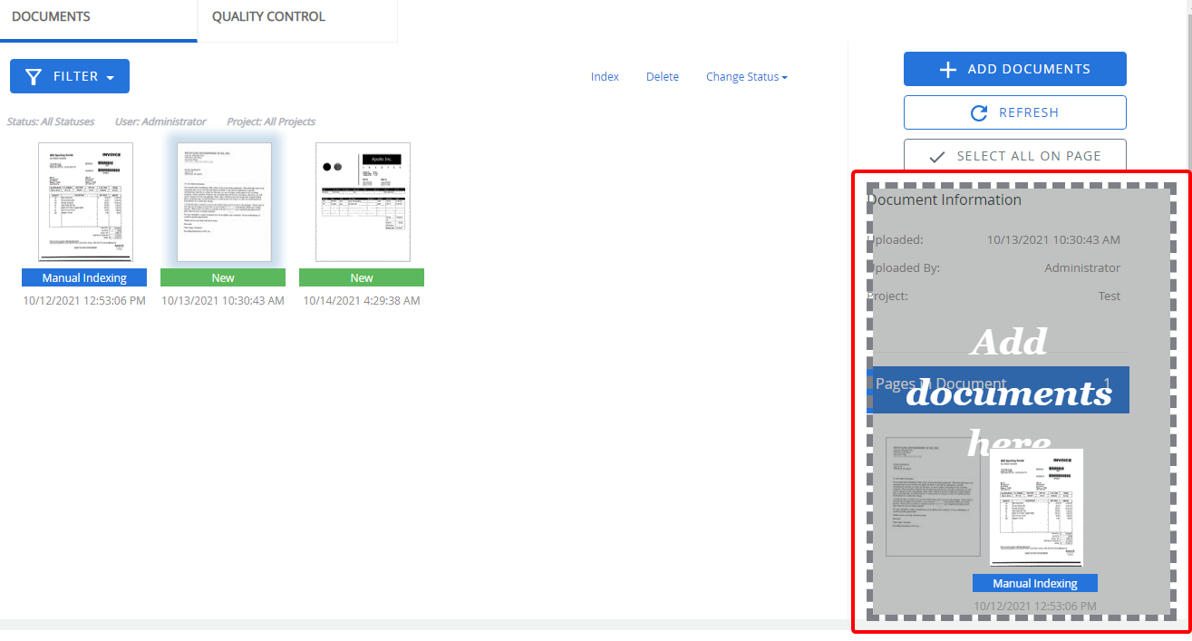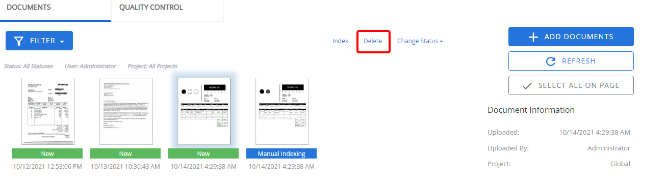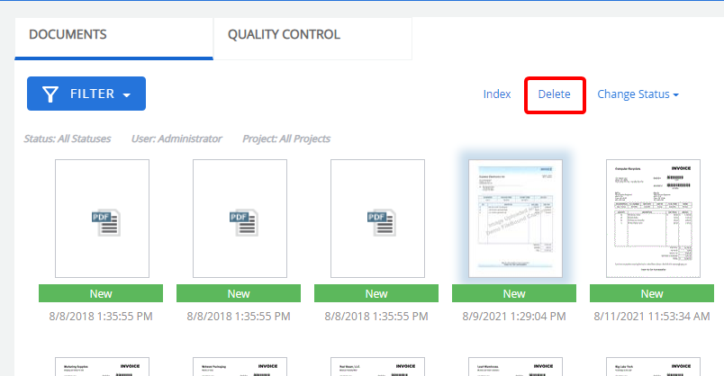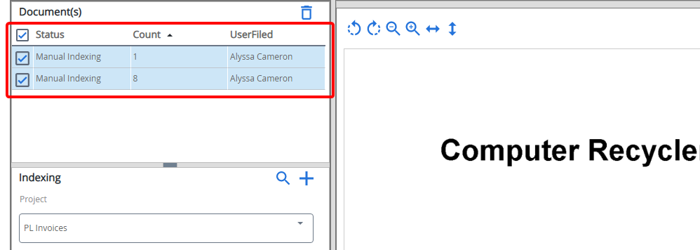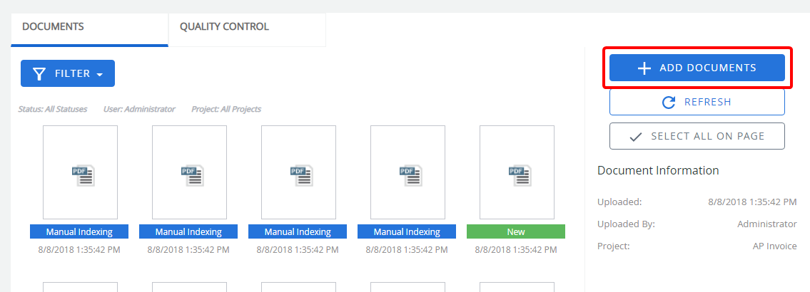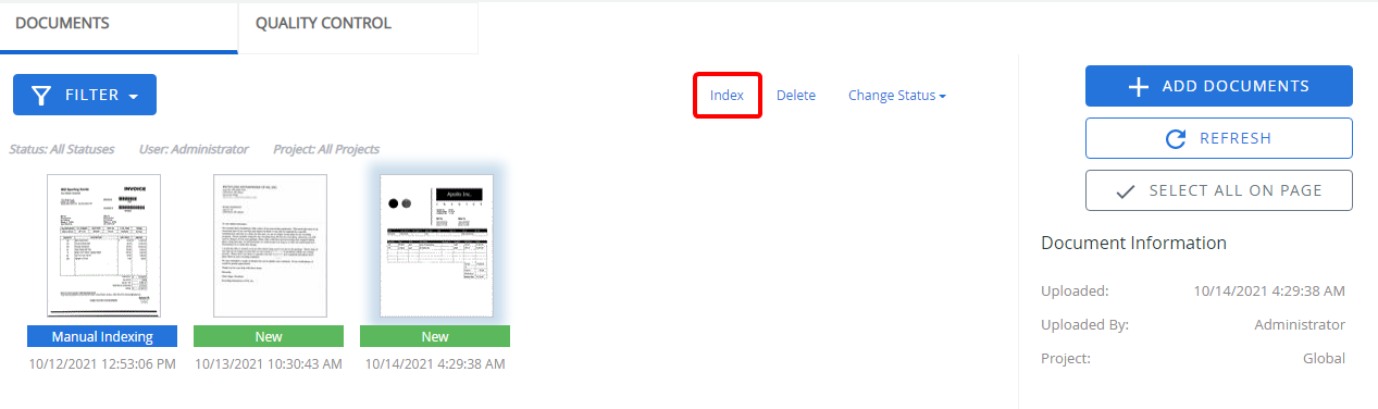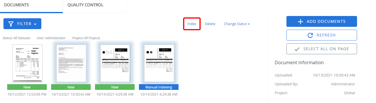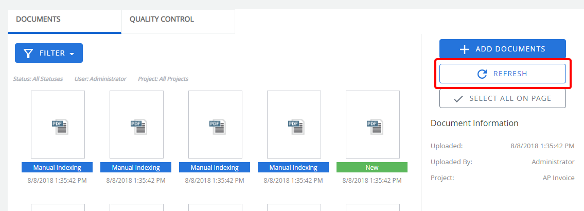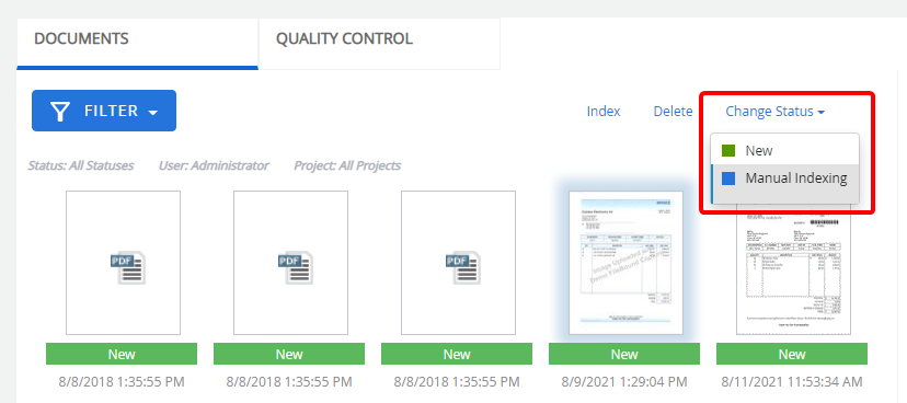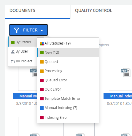When you are viewing documents in the Indexing Queue, it is sometimes necessary to filter the documents list to only display certain documents. Documents in the Indexing Queue can be filtered by status, user, or project.