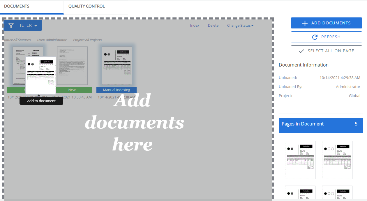 Documents uploaded by all users are visible to you if the Global Indexing User is not configured. If the Global Indexing User has been configured by a System Administrator, you can only view documents that you have uploaded and documents uploaded by the Global Indexing User.