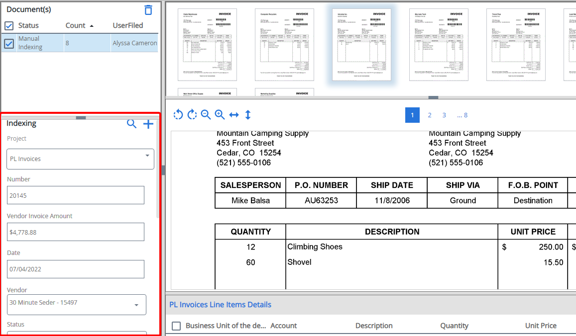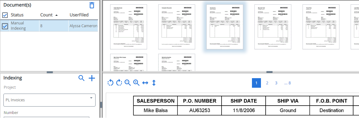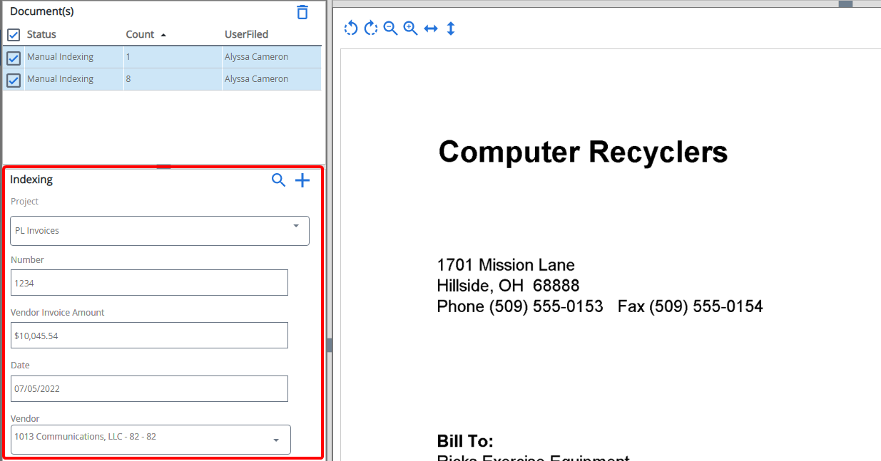 Manual Indexing: Documents that have been opened in the Indexing Queue indexing window are displayed. Documents opened in the Indexing Queue indexing window for manual indexing will not be queued to be handled by an automation process.