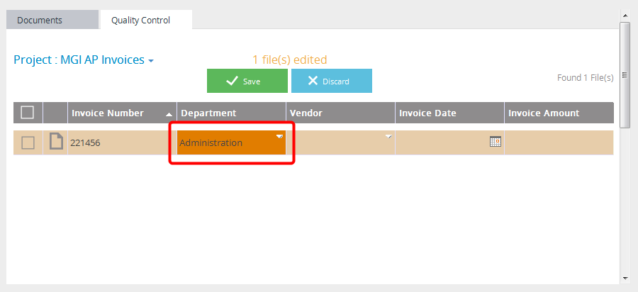 The Quality Control tab of the Indexing Queue gives System Administrators a place to review index field values that were either manually entered or applied during an Auto-Index automation process. A file can be approved, or rejected and sent back into the Indexing Queue. System Administrators can also fix or add index field values.
