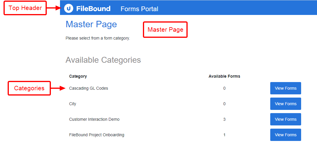 The Forms Portal is comprised of the following areas: