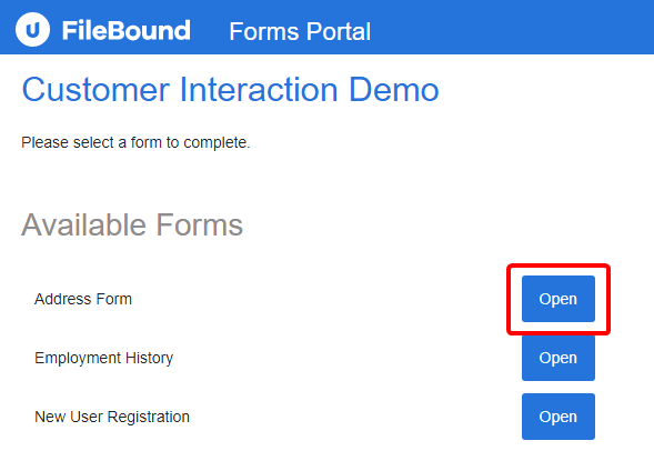 2. Click Open next to the form you want to open.